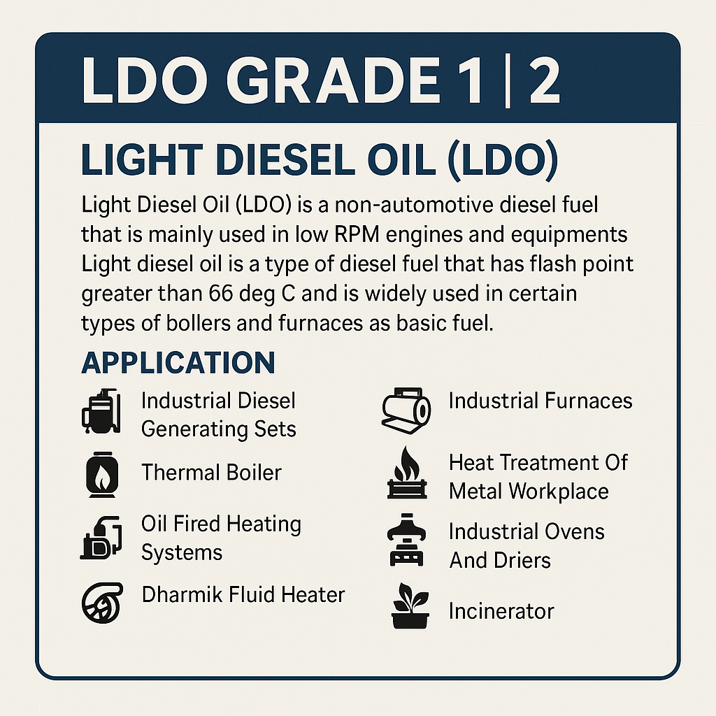 Light Diesel Oil (Ldo) Is A Non- automotive Diesel Fuel That Is Mainly Used In Low Rpm Engines And Equipments. Light Diesel Oil Is A Type Of Diesel Fuel That Has Flash Point Greater Than 66 Deg C And Is Widely Used In Certain Types Of Boilers And Furnaces As Basic Fuel.