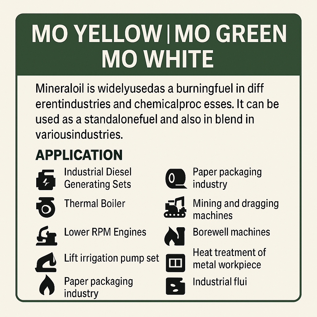 Mineraoil is widelyusedas a burningfuel in diff erentindustriesand chemicalproc esses.It can be used as a standalonefuel and also in blend in variousindustries.